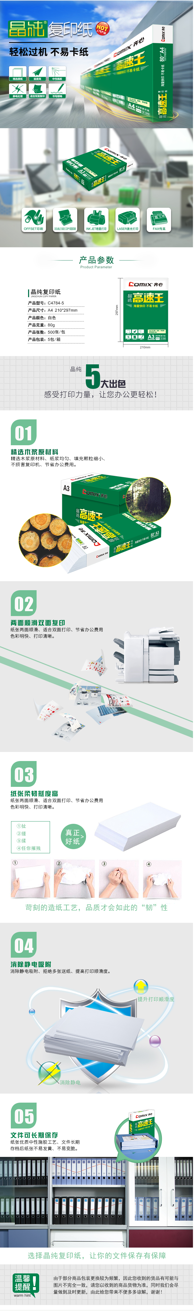 商品名称:齐心 C4784-5 晶纯高速王复印纸打印纸80克 A4 5包/件 56件/整卡板