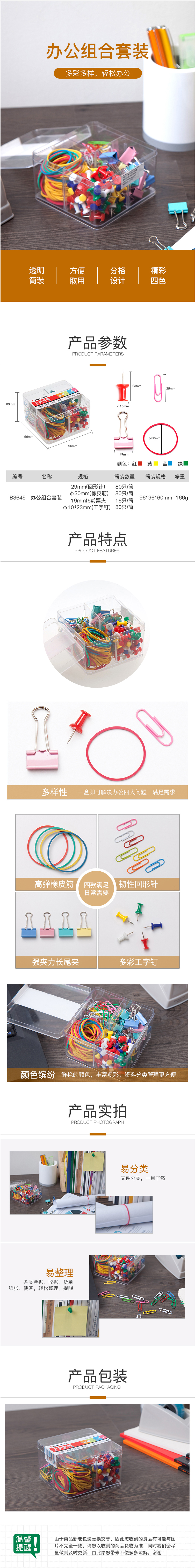 商品名称:齐心 B3645 文具套装 5#票夹/29mm回形针/橡皮筋/工字钉